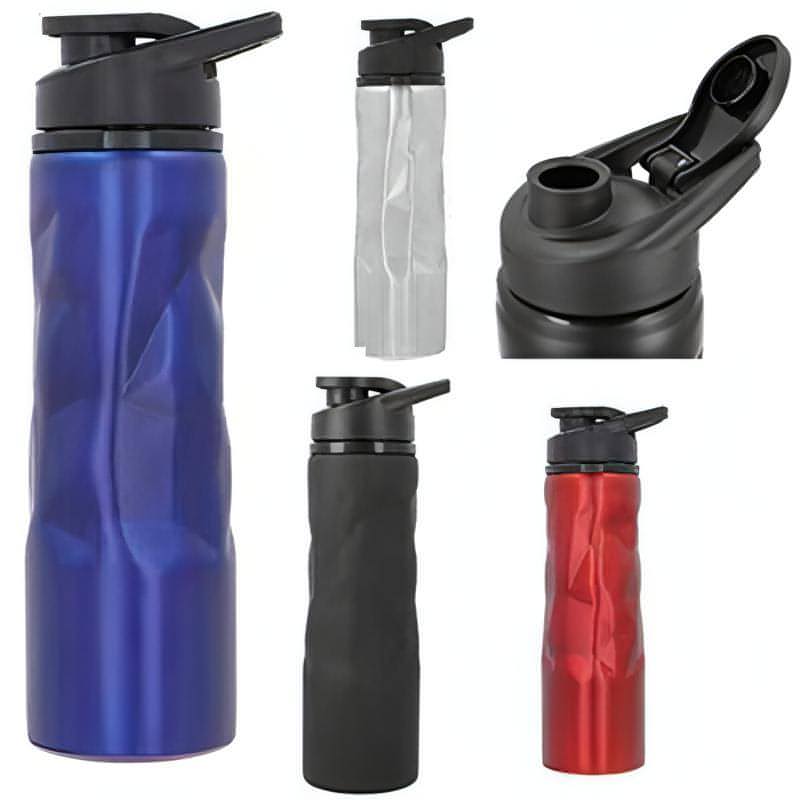 Cilindro metálico de acero inoxidable con asa de plástico.