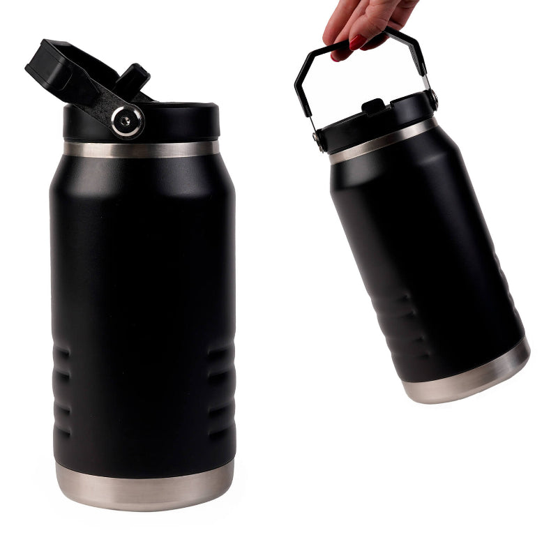 Termo con doble pared de acero inoxidable, insulado al vacío, con acabado rugoso y tapa enroscable que cuenta con boquilla abatible, popote y asa en la parte superior.