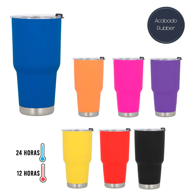 Termo de alta tecnología, acabado rubber con doble pared de acero inoxidable, que mantiene tus bebidas calientes y frías por más tiempo. Incluye tapa de presión transparente.