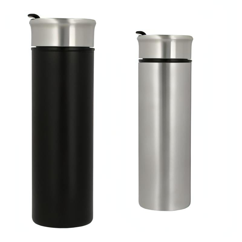 Termo de doble pared con interior de plástico y tapa enroscable a presión.