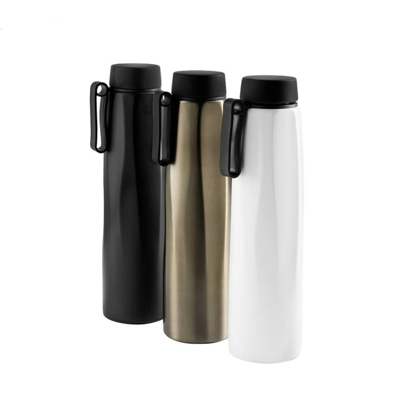 Termo doble pared. Cerrado al vacío. Pared interna y externa acero inoxidable. Tapa de rosca con terminado rubber para grabado efecto espejo. Incluye asa y caja individual.