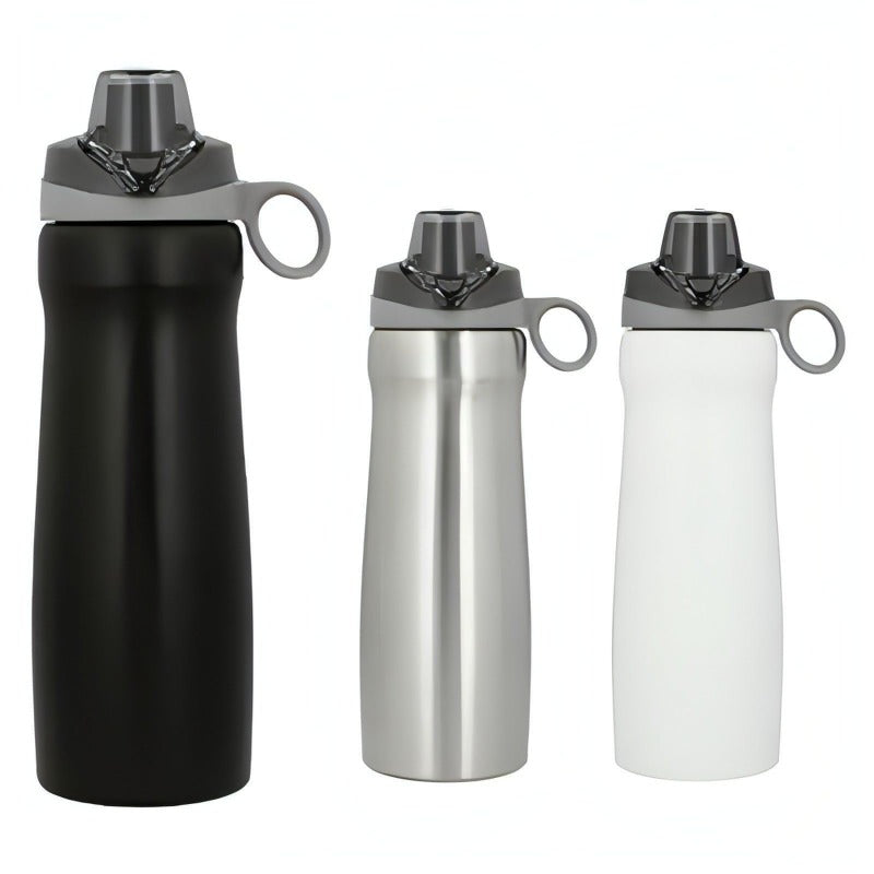 Termo de acero inoxidable con doble pared insulado al vacío, su novedosa tapa cuenta con una agarradera lateral y boquilla con cierre de seguridad.