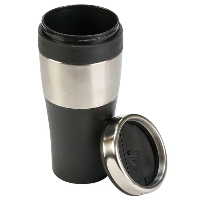 Termo con interior plástico y exterior acero inoxidable. Tapa con lengüeta deslizable color plata.