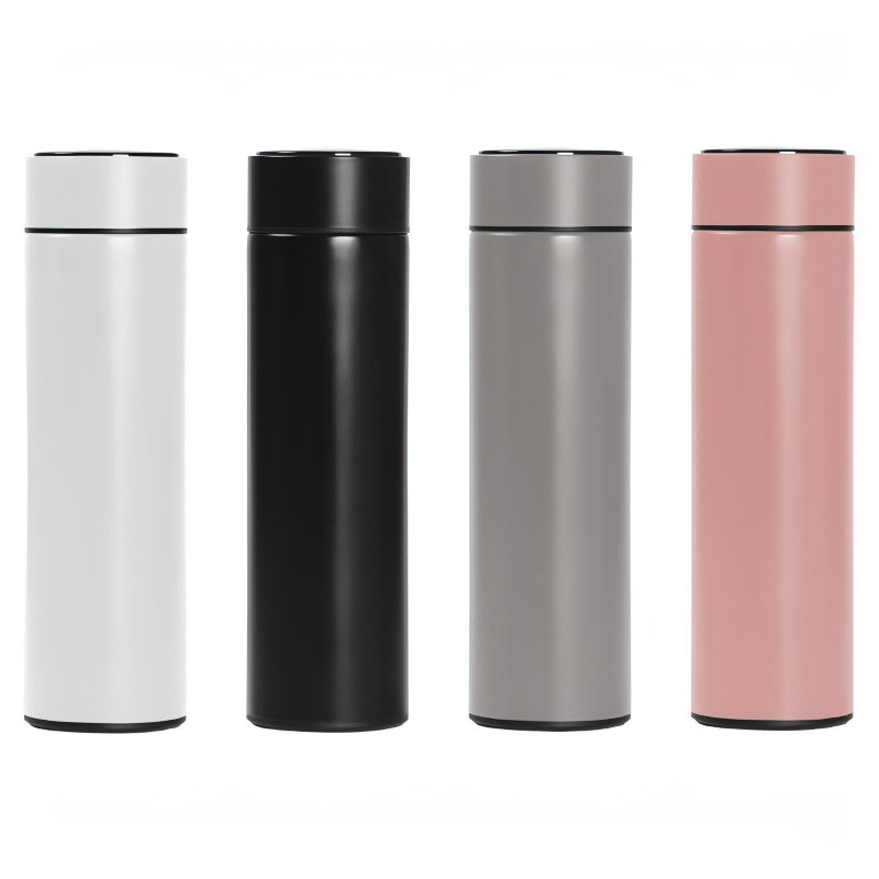 Termo inteligente de acero inoxidable doble pared; con pantalla LED indicadora de temperatura interior en la tapa. Fabricado en materiales de grado alimenticio, mantiene bebidas frías o calientes por un largo tiempo. La batería dura hasta 2 años. No usar en microondas. Capacidad de 500 ml. Incluye caja de cartón individual.