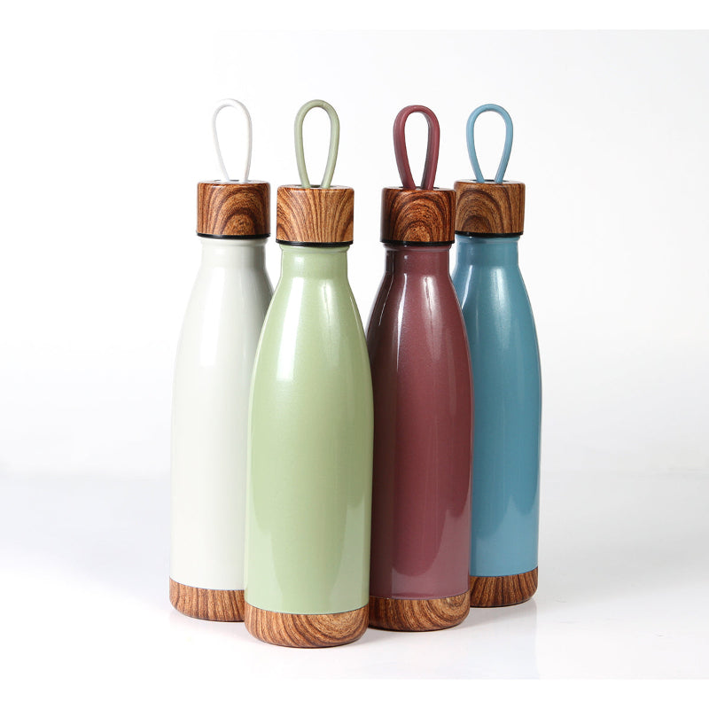 Termo de acero inoxidable doble pared, con correa de TPR, tapa de rosca y detalles apariencia madera, fabricado en materiales de grado alimenticio, mantiene bebidas frías o calientes por un largo tiempo, no usar en microondas. Capacidad de 500 ml (17 oz). Incluye caja de cartón individual.