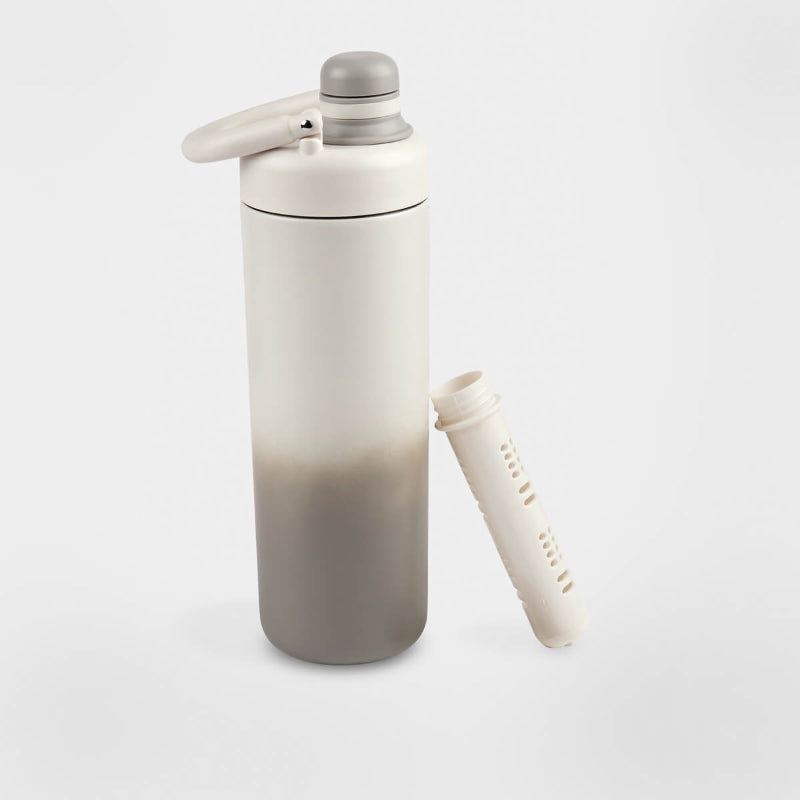 Termo doble pared. Cerrado al vacío. Pared interna y externa de acero inoxidable. Terminado en texturizado rugoso, que facilita su agarre. Incluye tapa de plástico con sistema de rosca, sobre tapa con boquilla y filtro interno para infusiones o tisanas. Su diseño elegante y minimalista se complementa con un asa ergonómica que facilita el transporte, ideal para transportarlo a donde quiera que vayas. El termo está pintado a mano, por lo tanto el color y degradado pueden variar en todos los modelos. Mantiene tus bebidas calientes por 6 hrs y frías hasta 12 hrs. Capacidad de 27 Oz. Incluye caja individual.