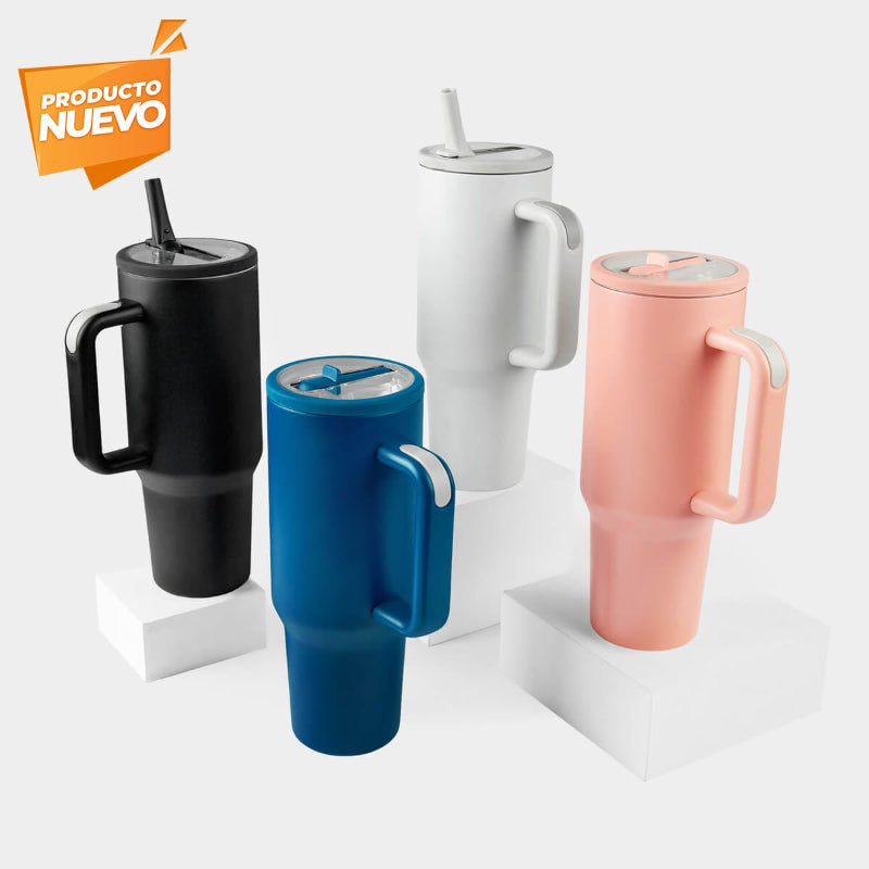 Termo doble pared. Cerrado al vacío. Pared interna y externa de acero inoxidable. Tapa de plástico con cierre de rosca que incluye boquilla con popote. Capacidad de 40 Oz. Base de 7.6 cm de diámetro.
