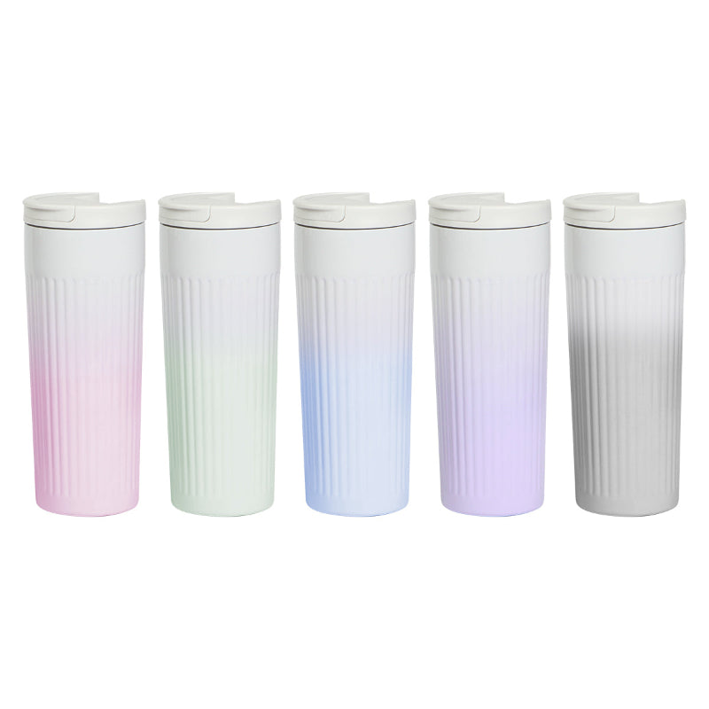 Termo cilindro de doble pared de acero inoxidable con tapa plástica y colores degradados, su tapa es ideal para transportar bebidas calientes con seguridad y sin derrames. Capacidad de 500 ml, no usar en microondas, incluye caja individual.
