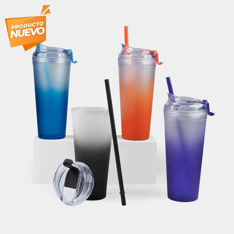 Vaso doble pared. Pared interna y externa de plástico. Tapa de plástico con sistema de rosca. Sobretapa con sistema push. Incluye popote. Cuerpo con terminado tipo rubber y degradado de color. Capacidad 24 Oz. Base de 7 cm de diámetro. Incluye caja individual.