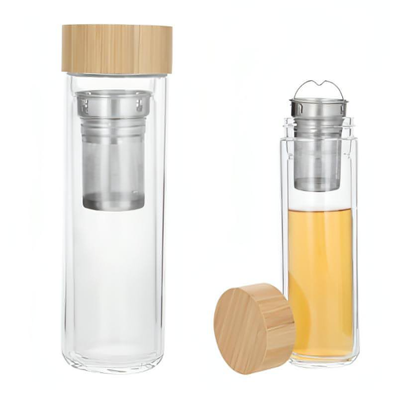 Termo con doble pared de vidrio e infusor, colador de metal y tapa de bambú enroscable.