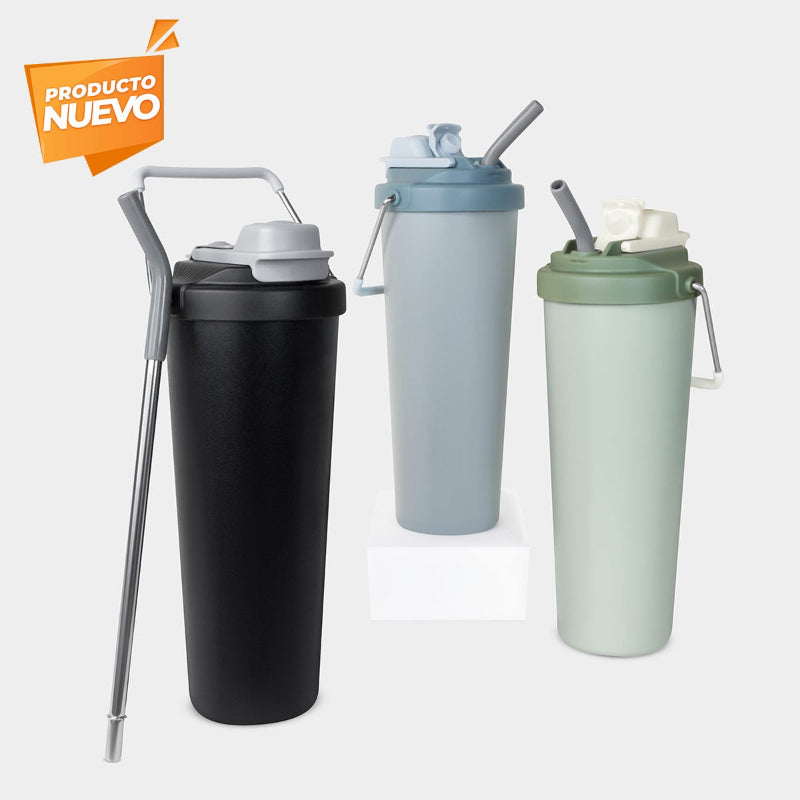 Termo doble pared. Cerrado al vacío. Pared interna y externa acero inoxidable. Cuerpo con terminado rugoso. Tapa de plástico con sistema de rosca y doble sobretapa con cierre push, una con boquilla para beber y otra con ranura para popote. Agrega un asa metálica con recubrimiento de silicón para llevarlo contigo a todos lados. Mantiene la temperatura caliente por 4 hrs y la temperatura fría por 8 hrs. Capacidad de 25 Oz. Base de 7 cm de diámetro. Incluye caja individual.
