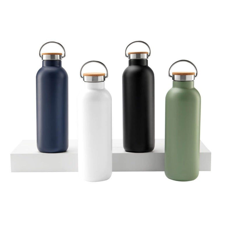 Termo doble pared. Cerrado al vacío. Pared interna y externa de acero inoxidable. Tapa con sistema de rosca de acero inoxidable con corcho y asa metálica. Mantiene temperatura caliente 6 hrs y temperatura fría 12 hrs. Incluye caja individual.