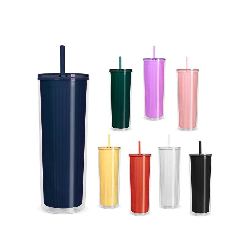 Termo de plástico doble pared. Pared interna de color, texturizada a rayas, y pared externa lisa y transparente que, en conjunto, ofrecen un diseño moderno y vibrante. Incluye tapa de plástico con sistema push y popote a juego que proporciona comodidad en cada sorbo. Capacidad de 22 Oz. Base de 7.5 cm de diámetro. Incluye caja individual.
