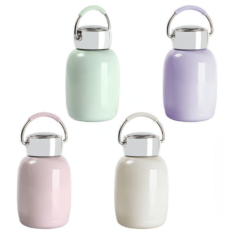 Termo de acero inoxidable doble pared con tapa de plástico, asa metálica y detalle de color en asa. Fabricado en materiales de grado alimenticio, mantiene bebidas frías o calientes por un largo tiempo. No usar en microondas.