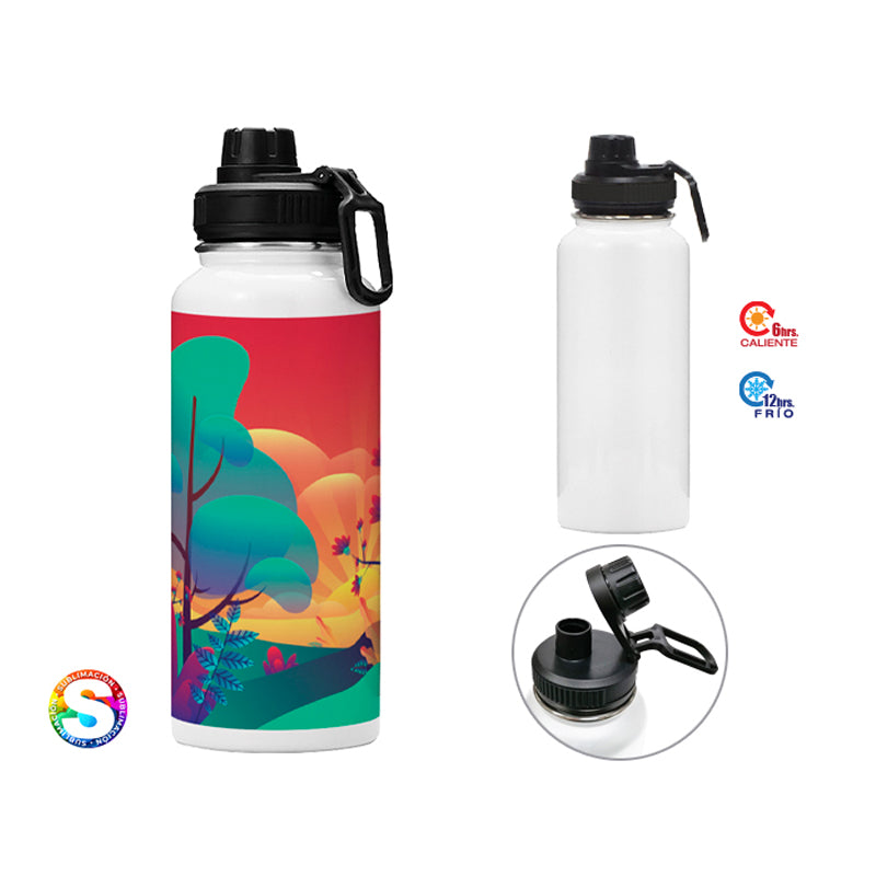 Termo de doble pared para sublimación insulado al alto vacío. Mantiene las bebidas frías por 12 hrs. y calientes por 6 hrs. Tapa de rosca con boquilla y asa para sujetarlo fácilmente. CAP. 1,200 ml. (40 OZ). Presentación: Caja en color negro.