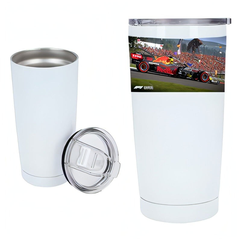 Termo sublimable con doble pared de acero inoxidable insulado al vacío. Incluye tapa de cierre a presión transparente y seguro deslizable.