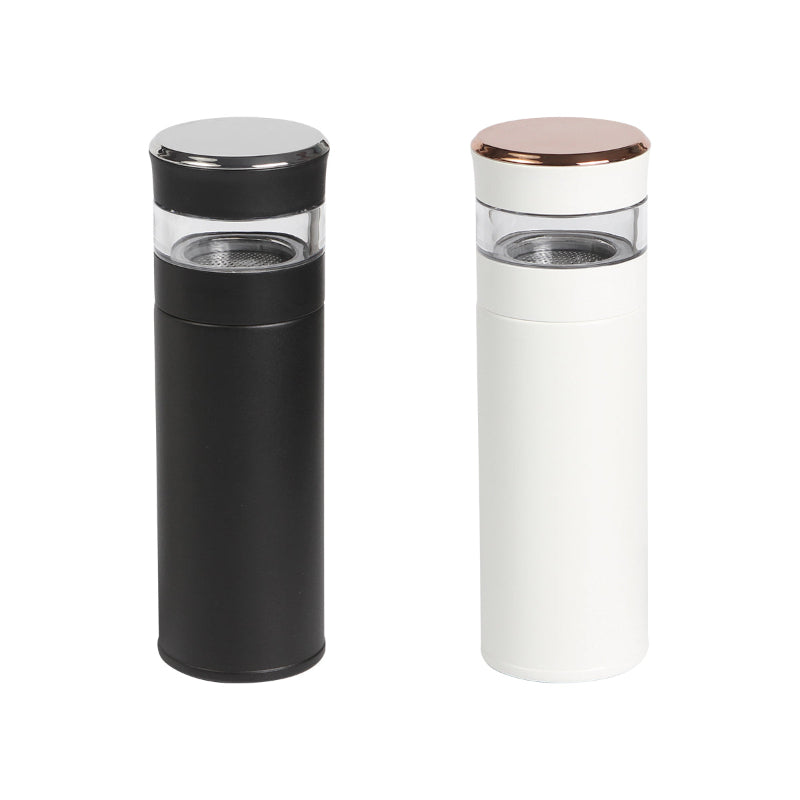 Termo de acero inoxidable doble pared con display de temperatura en la tapa, sección para infusiones con rejilla coladora, fabricada en materiales de grado alimenticio, mantiene bebidas frías o calientes por un largo tiempo. No usar en microondas. Capacidad de 400 ml. Incluye caja de cartón individual.