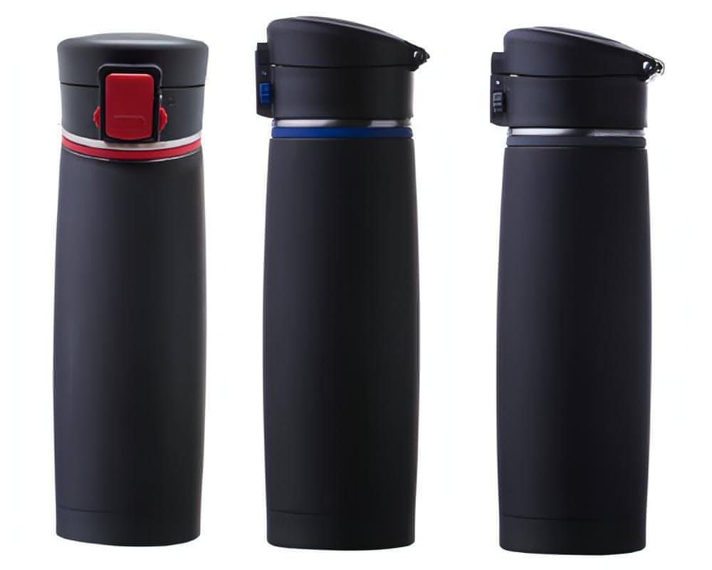 Termo de acero inoxidable con doble pared, esmalte negro con detalles en tres colores diferentes, incluye tapa con rosca que evita derrames, interior en acero 304, cuenta con candado de seguridad en la boca de la botella. Ideal para traer en la mochila.