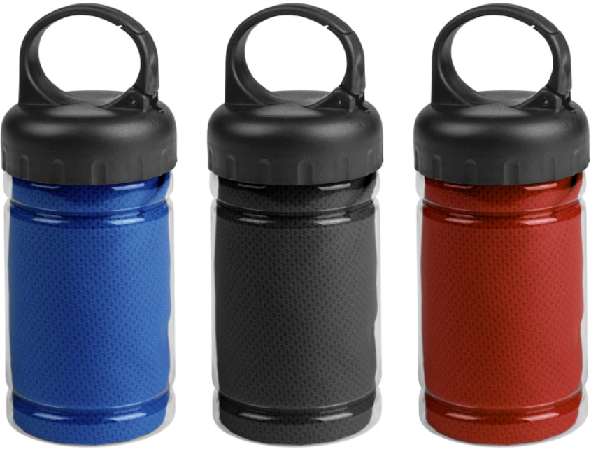 Toalla de enfriamiento en un estuche de plástico transparente. Para un efecto refrescante humedezca la toalla con agua o agregue agua en el cilindro e incorpore la toalla. Tapa a rosca con mosquetón.