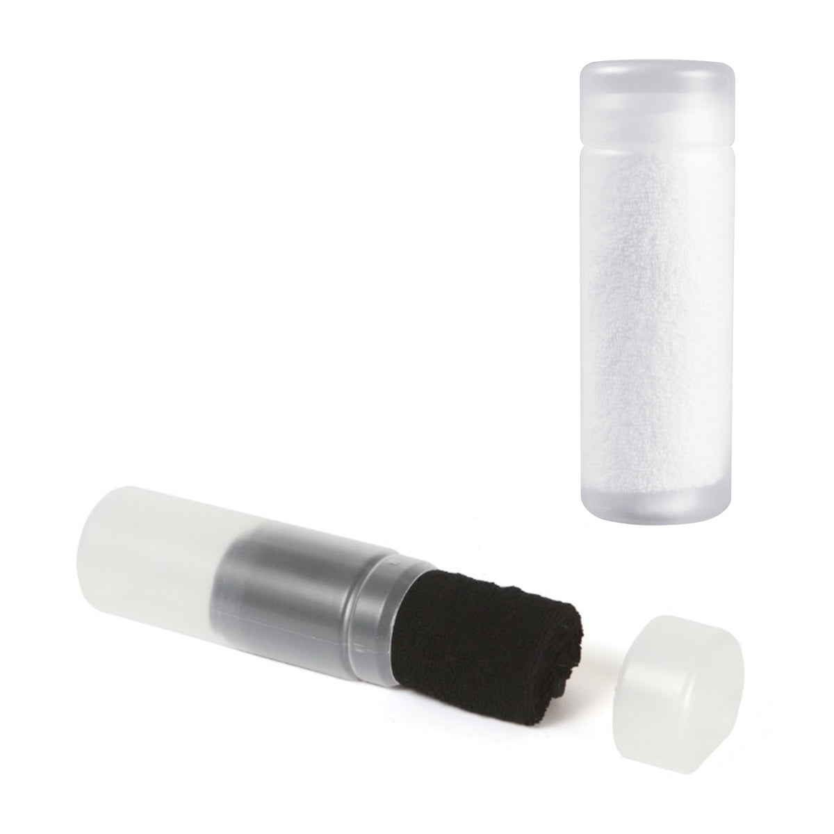 Toalla de mano fabricada en algodón color blanca con estuche cilíndrico de plástico translúcido. Ideal para llevarla al gimnasio.