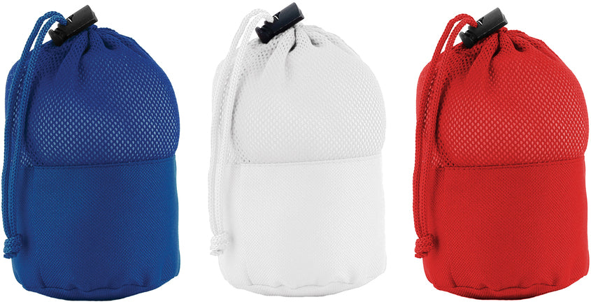 Toalla que se enrolla y guarda en bolsa de red.