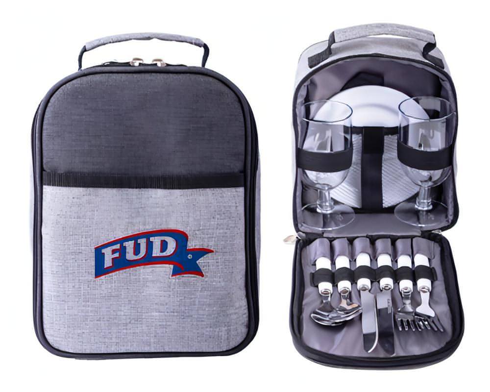 Set portátil de utensilios para dos personas. Incluye: 2 platos de melamina, 2 tenedores, 2 cucharas, 2 cuchillos, 2 copas y estuche de poliéster.