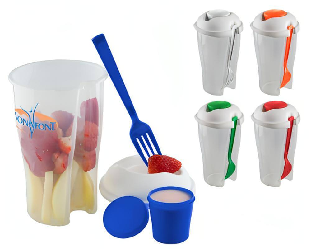 Vaso transparente para ensalada con vasito para complementos y tenedor. Cap: 700ml.