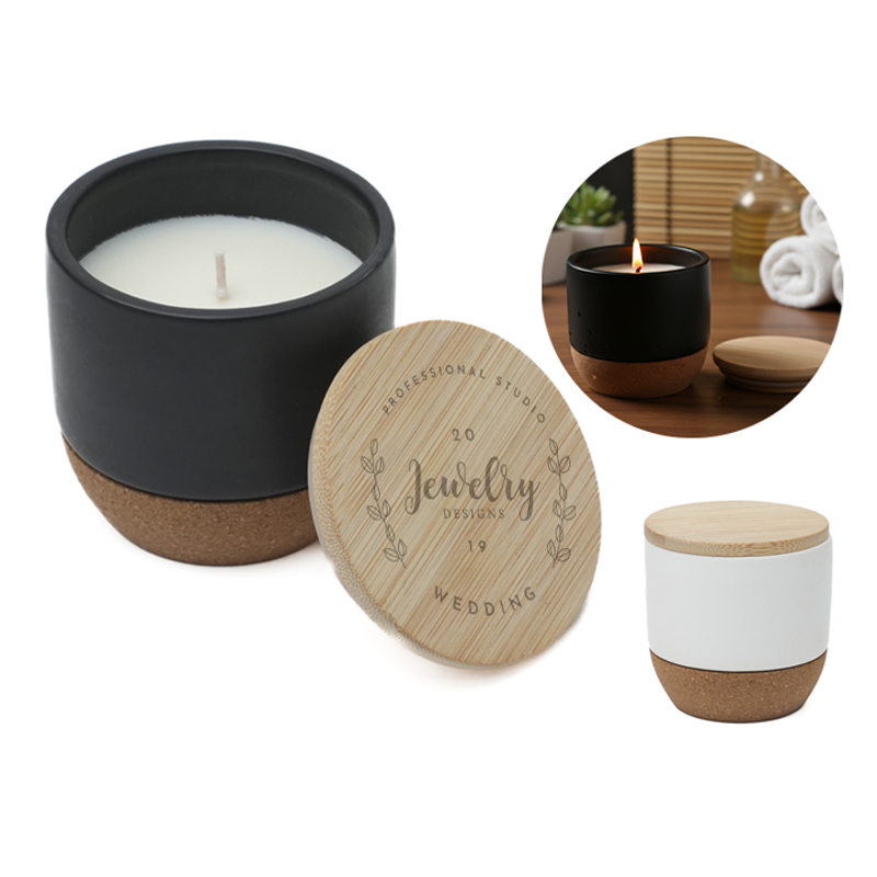 Vela decorativa de cera blanca de soya con concentración de fragancia de vainilla al 2%, en tarro de cerámica con tapa de bambú y base de corcho. Presentación: caja individual.
