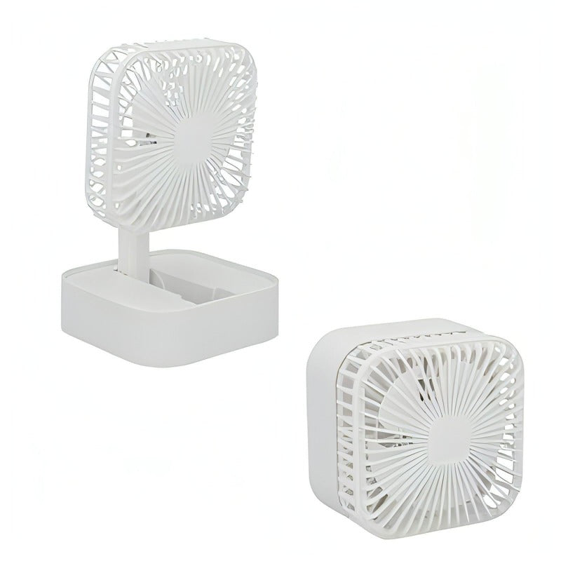 Mini ventilador plegable y de tamaño ajustable capaz de cambiar su posición a 180°. Incluye 3 velocidades, batería recargable y cable de carga DC5V.